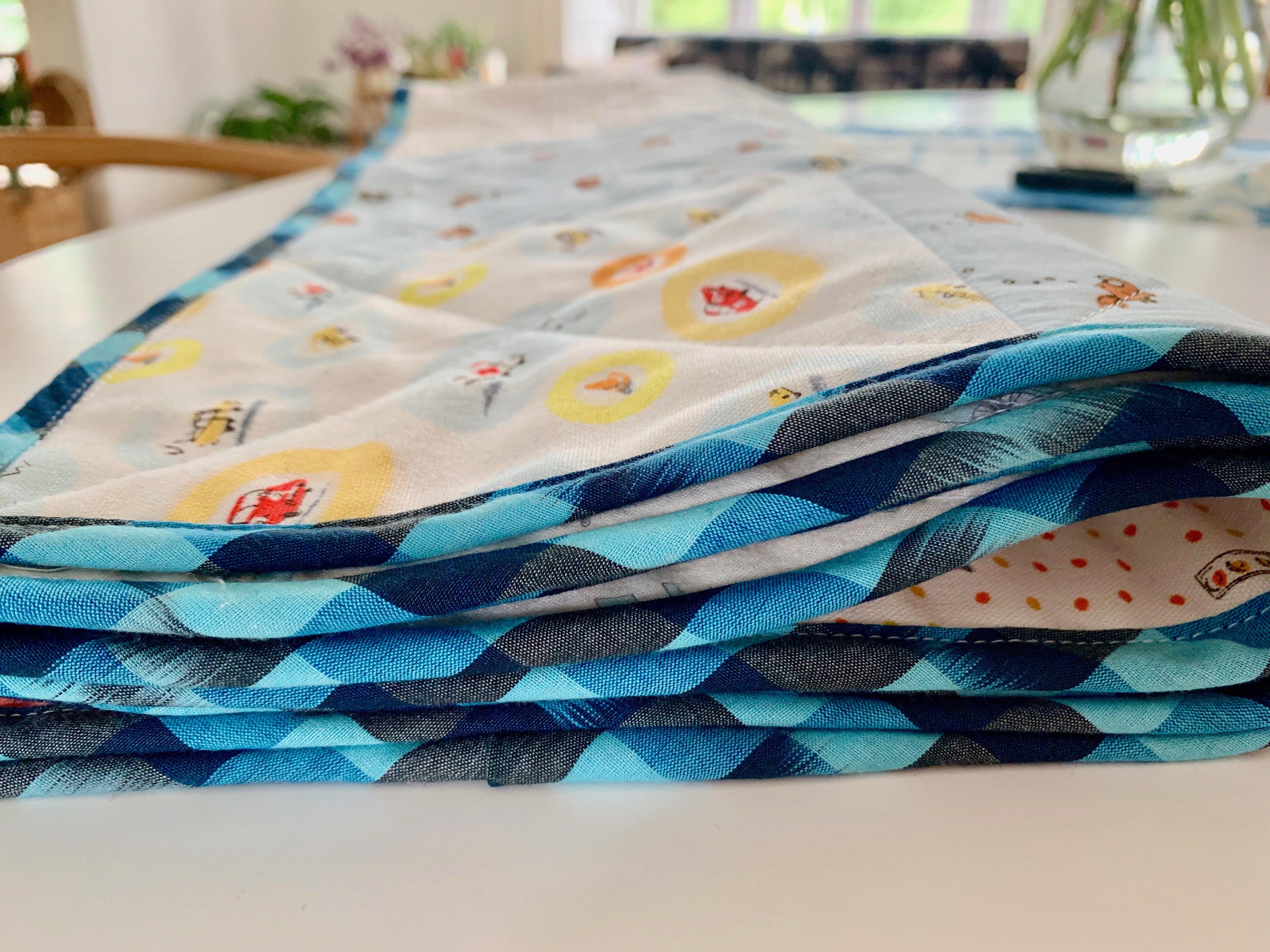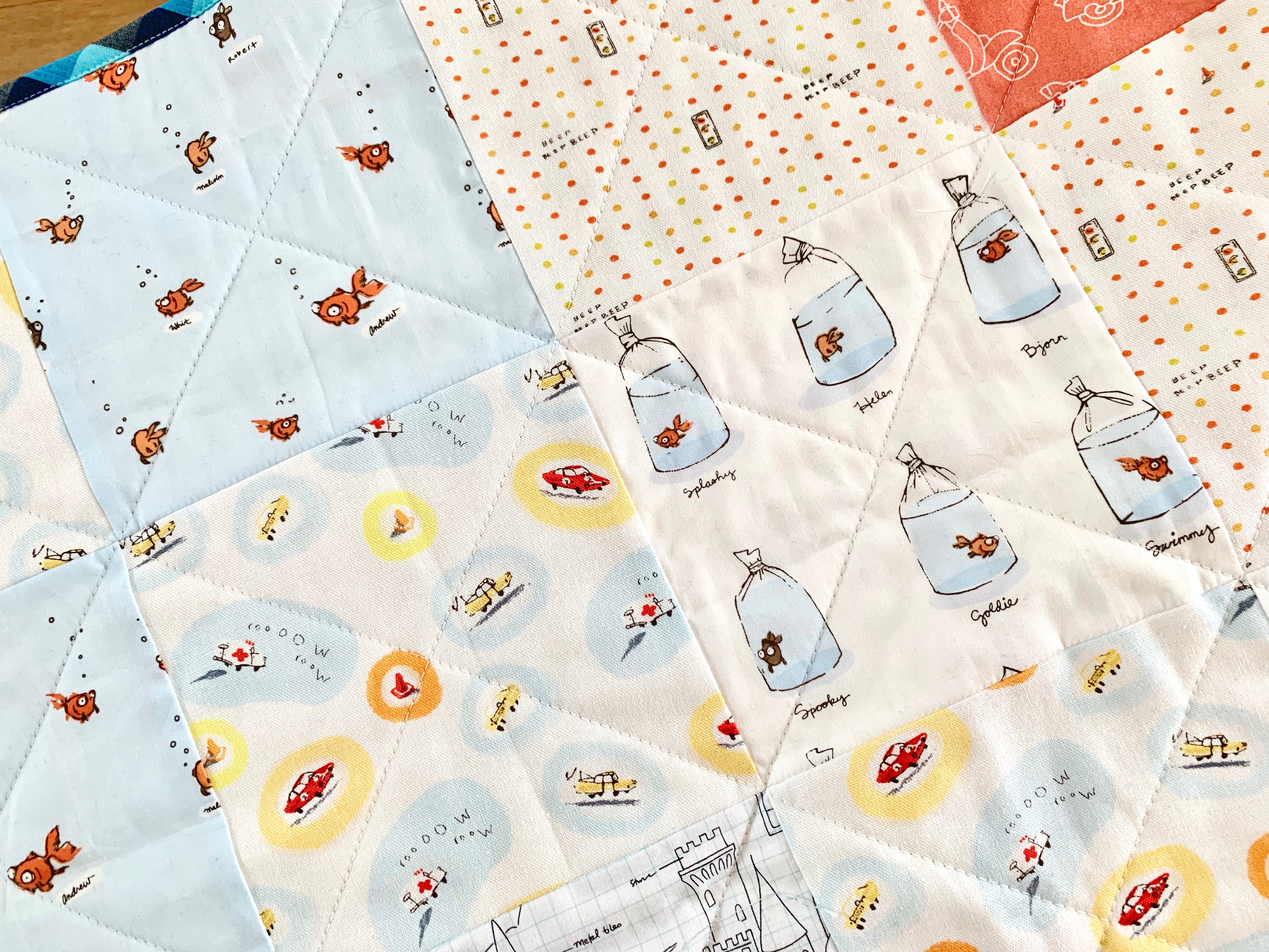 I only had enough for two square of the elephants one, but had to include it. The binding is a fabulous Anna Maria Horner fabric cut on the bias (go me!) and I’m particularly happy I had enough of it. It uplifts the whole thing, me thinks.