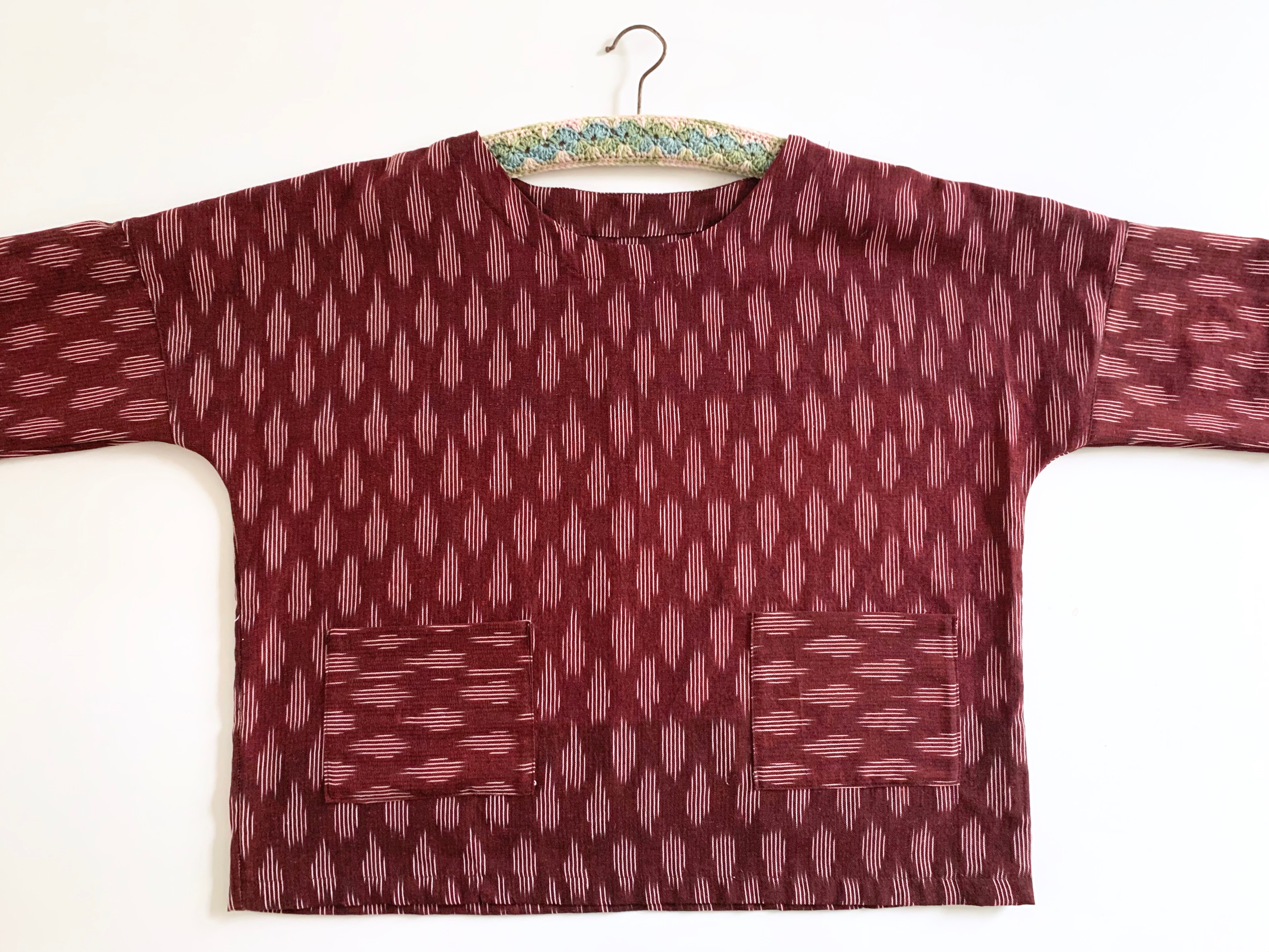 I wasn’t sure what size to do so I went for the ‘top’ version (less fabric required) and used a piece of IKAT fabric I’ve had for ages, figuring that if it worked out at least I could wear it around the house. Well, well, well… I love it!