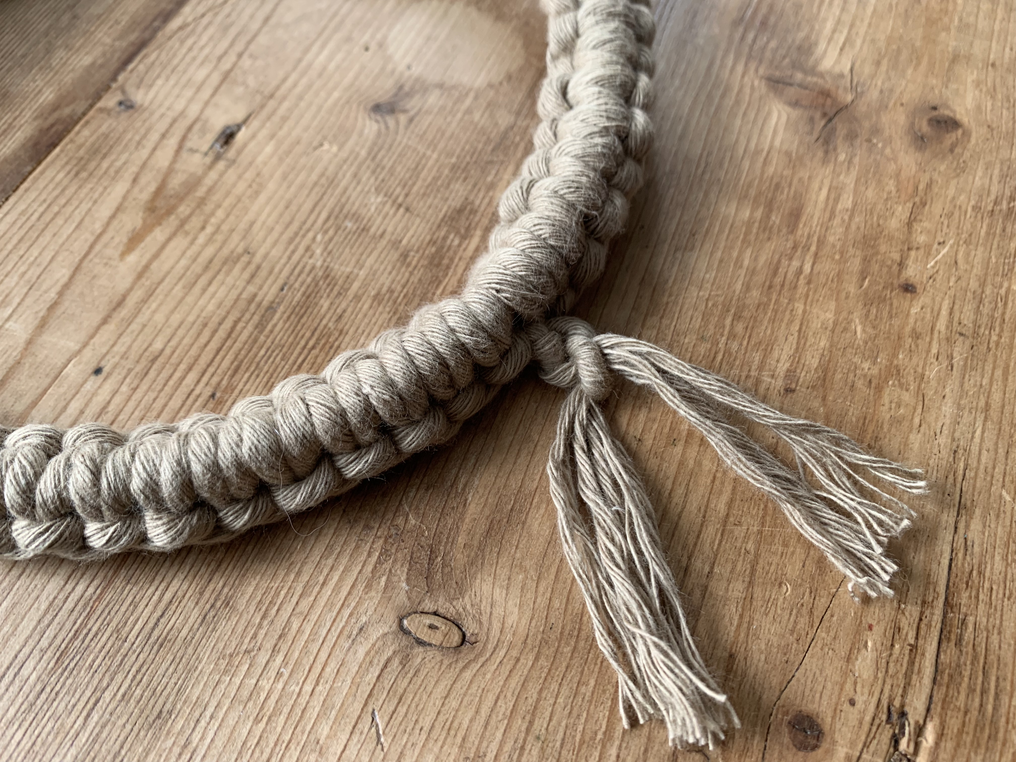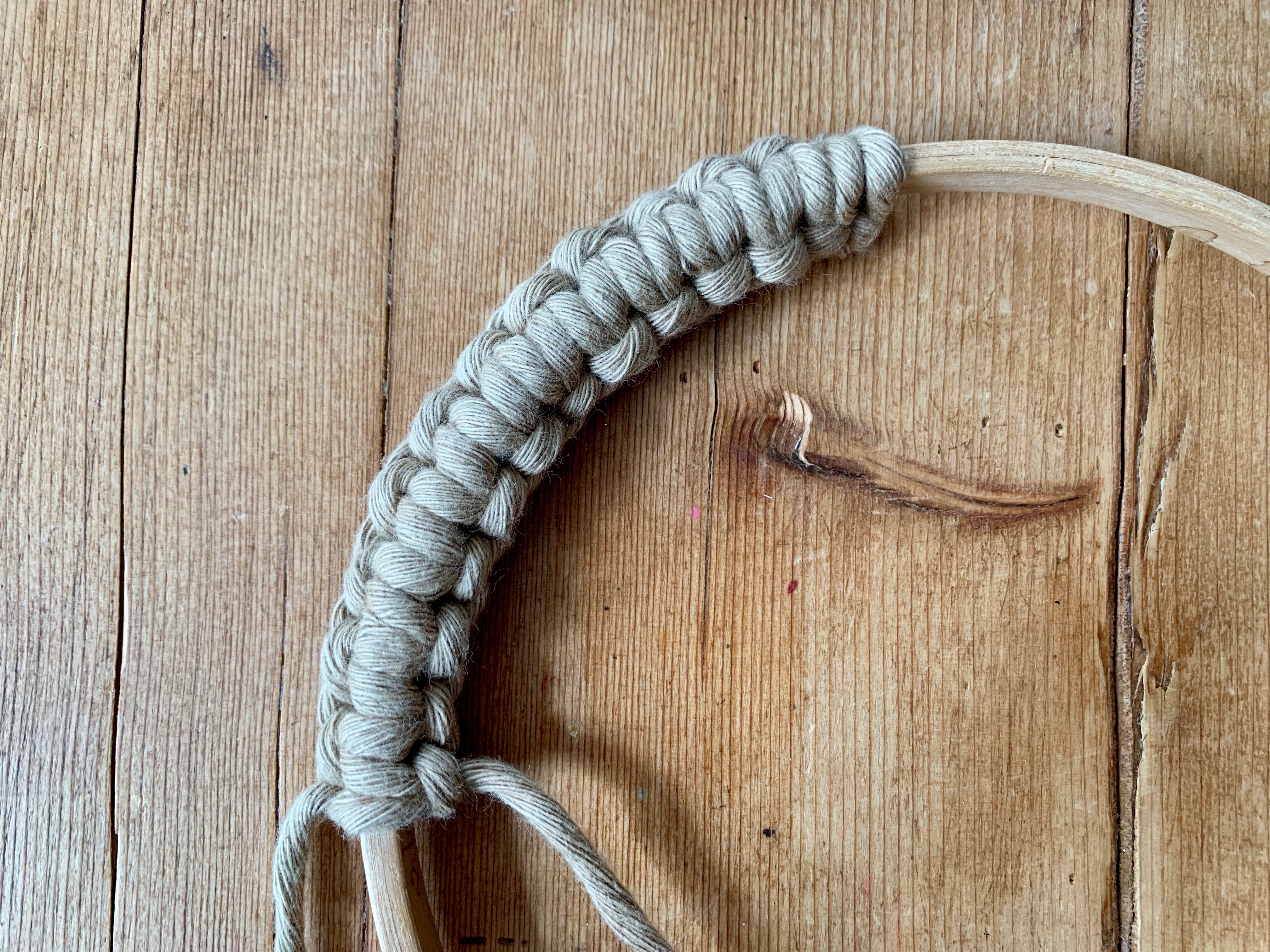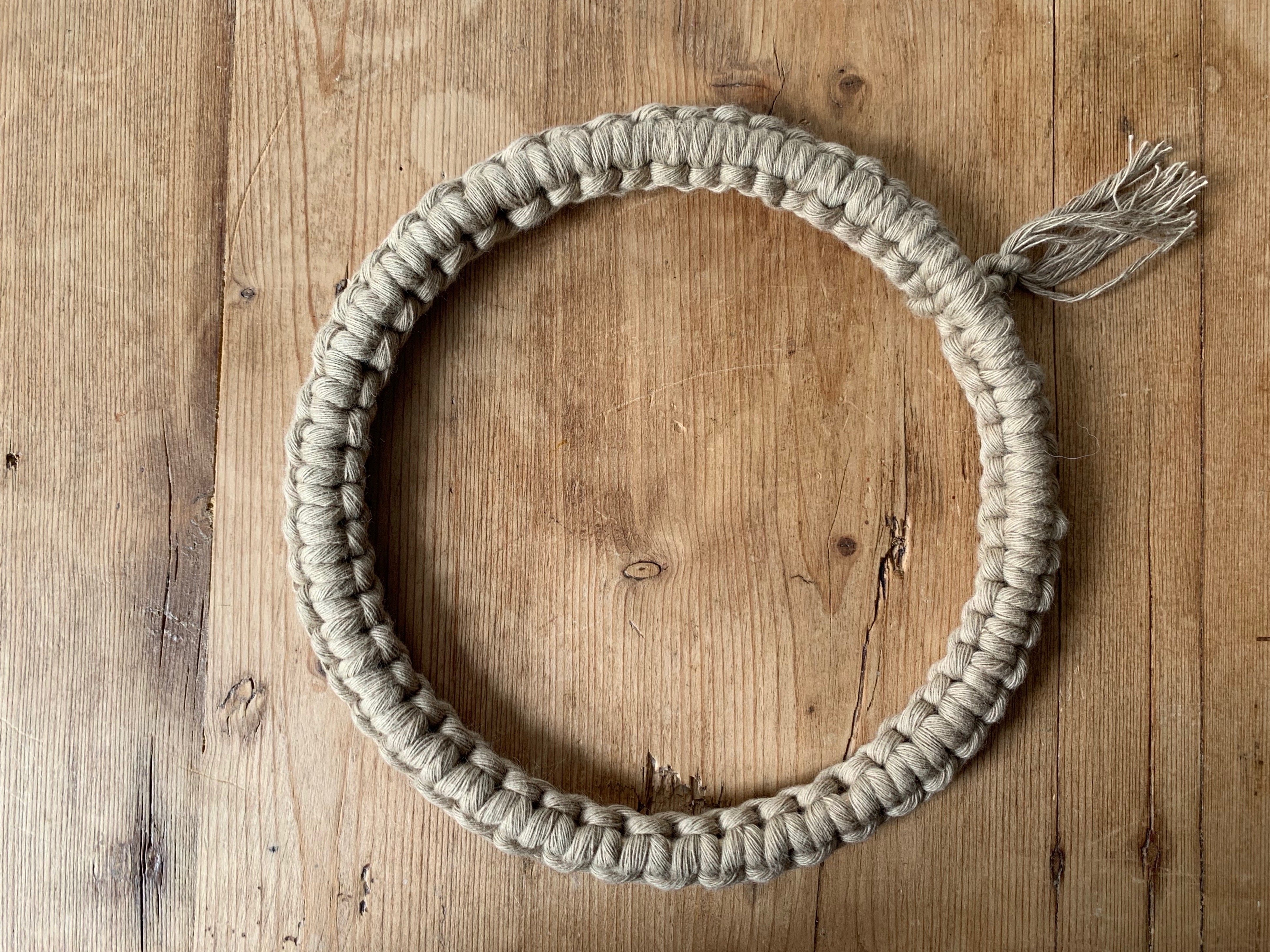 I used a 6″ wooden embroidery hoop (half… who knows where the other half has gone) and, get ready for this 22 feet of rope. YUP, twenty two feet… macrame eats rope like my kids eat Nutella. Greedily.