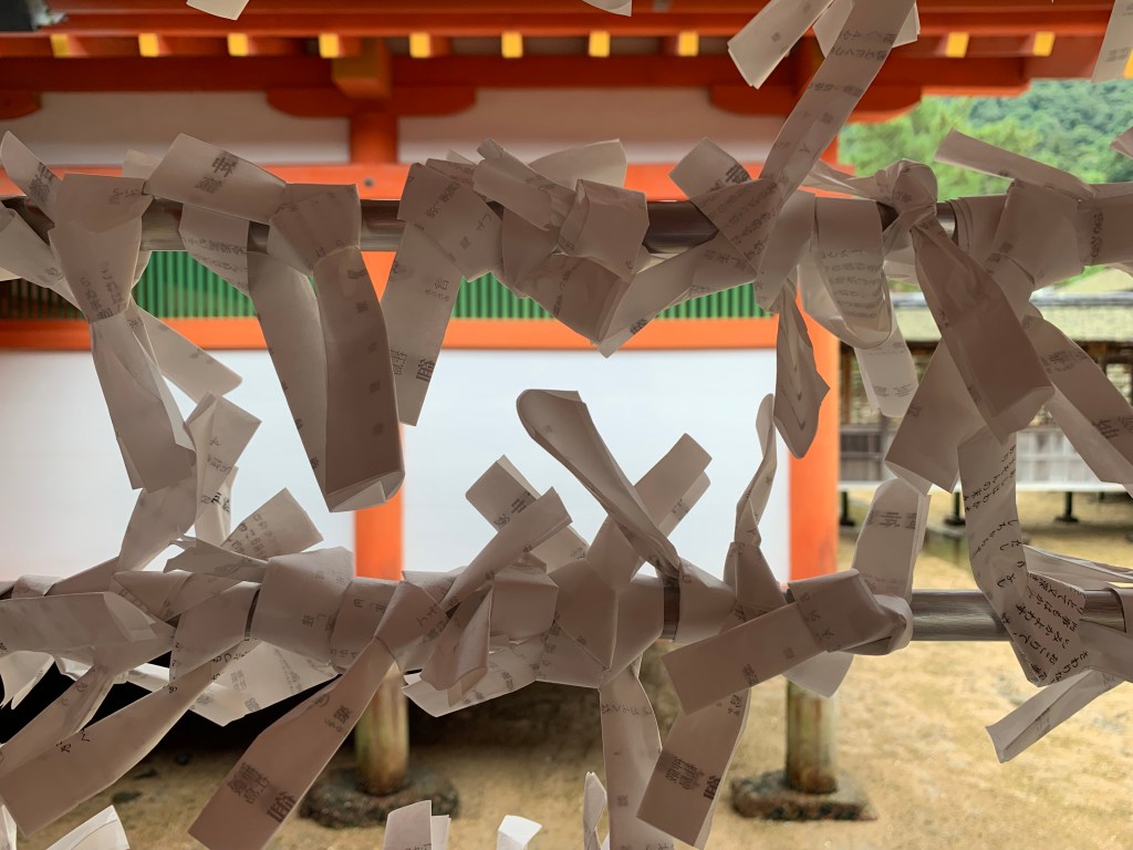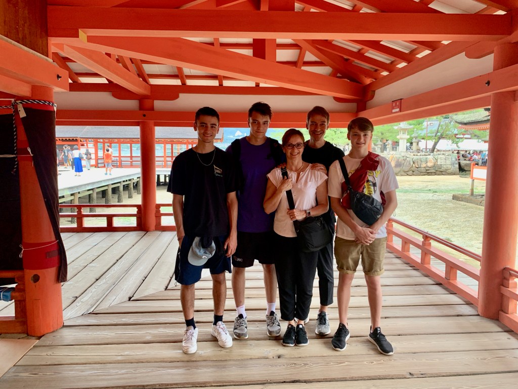 After a slightly surreal Italian lunch (they boys were left slightly traumatised by the previous night dinner and needed familiar flavours), we took a ferry to Miajima Island to see the famous floating ItsukushimaTorii and Shrine. Unfortunately the gate was under wrap but the shrine was glorious in all its red glory.