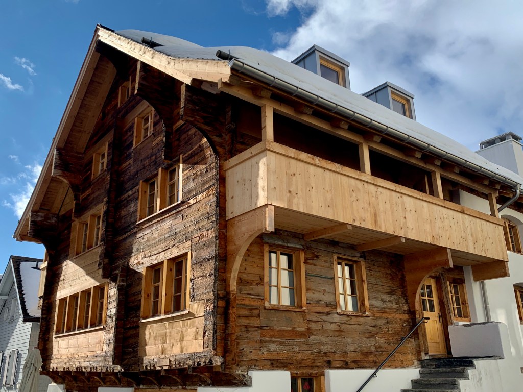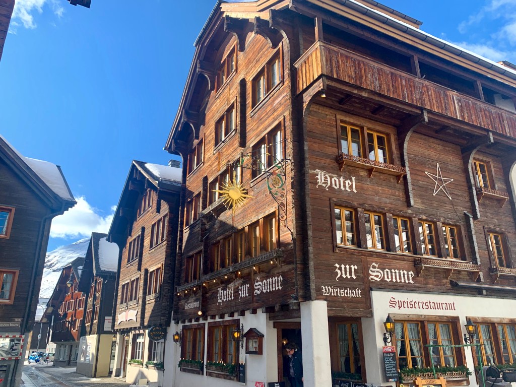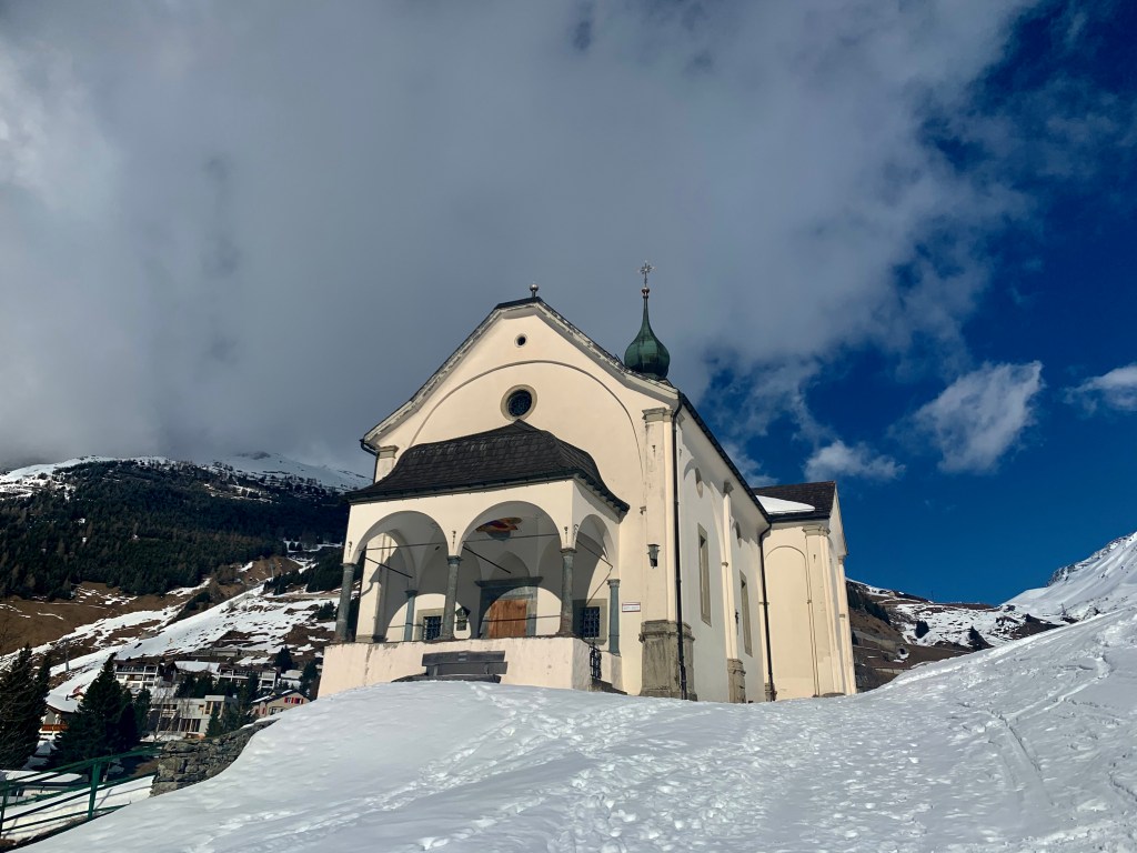 … it started off cloudy…… then it started to clear…… and then it was amazing once again…… the snow got very slushy and heavy after lunch so we explored the village of Andermatt…… it’s very pretty…… with lots of ‘classically Swiss’ buildings…… overlooking the village on one side and the mountains on the other is this gorgeous small chapel…… that porch was a real sun trap…… and offered great views…… more local architecture, this was a gorgeous re-model…… and this one was totally cute…… and this one was very grand and had purple shutters, and faced…… the main church of the town…and then I visited the local ‘beckerei’ because it’s good to support the local economy… ooh yes… come to mummy…